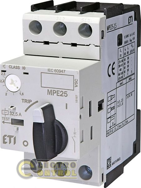 Автоматичний вимикач захисту двигуна MPE25-2,5 призначені для пуску електродвигунів невеликої потужності й захисту їх від перевантажень і коротких замикань. Можуть застосовуватися як аварійний або головний вимикач. У комплекті з контакторами РЄ, або СЕМ можна реалізувати системи дистанційного керування.