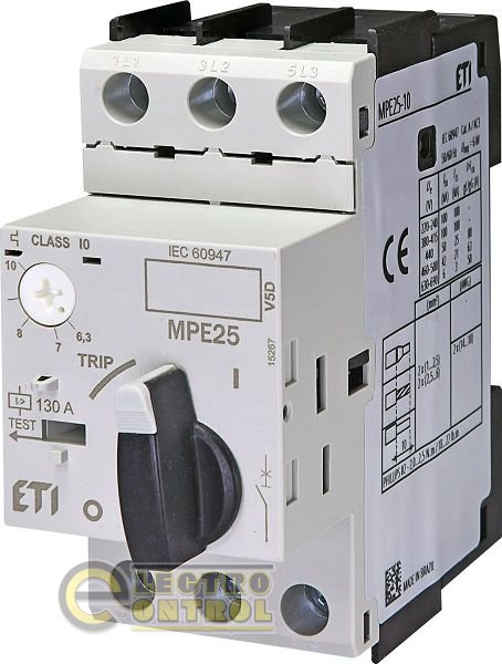 Автоматичний вимикач захисту двигуна MPE25-10 призначені для пуску електродвигунів невеликої потужності й захисту їх від перевантажень і коротких замикань. Можуть застосовуватися як аварійний або головний вимикач. У комплекті з контакторами РЄ, або СЕМ можна реалізувати системи дистанційного керування.