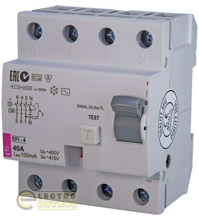 Пристрій захисного відключення (ПЗВ) EFI-4 40/0,1 AC (10kA) 2063143 ETI розроблене для захисту людини від поразки електричним струмом у випадку його дотику, прямого або непрямого, до оголеним проводам або несправним електричним приладам. Також диференціальне реле ETI EFI допоможе уникнути пожежі у випадку несправності електропроводки. Застосовувати даний пристрій необхідний у мережі з типами схем заземлення TN-S, TN-C, IT.