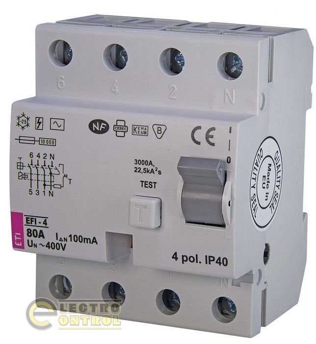 Пристрій захисного відключення (ПЗВ) EFI-4 80/0,1 AC (10kA) 2063145 ETI розроблене для захисту людини від поразки електричним струмом у випадку його дотику, прямого або непрямого, до оголеним проводам або несправним електричним приладам. Також диференціальне реле ETI EFI допоможе уникнути пожежі у випадку несправності електропроводки. Застосовувати даний пристрій необхідний у мережі з типами схем заземлення TN-S, TN-C, IT.