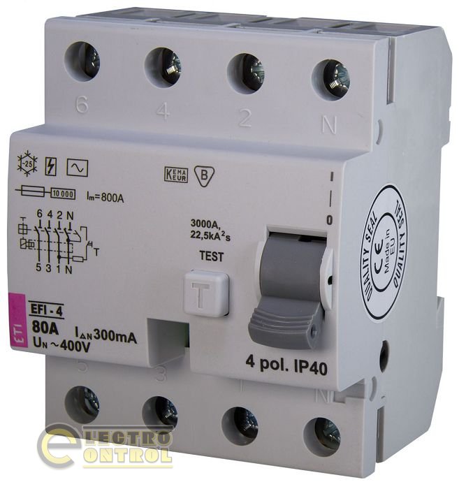 Пристрій захисного відключення (ПЗВ) EFI-4 80/0,3 AC (10kA) 2064145 ETI розроблене для захисту людини від поразки електричним струмом у випадку його дотику, прямого або непрямого, до оголеним проводам або несправним електричним приладам. Також диференціальне реле ETI EFI допоможе уникнути пожежі у випадку несправності електропроводки. Застосовувати даний пристрій необхідний у мережі з типами схем заземлення TN-S, TN-C, IT.
