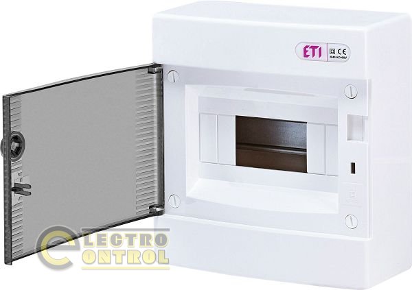 На даній сторінці інтернет-магазину eschop (Електроконтроль), Ви можете ознайомитися й купити щит зовнішній розподільний ECT 8PT (8 модулів, прозорі двері) 1101000 ETI. Такі пластикові щити внутрішнього й зовнішнього виконання встановлюються в житловому й виробничому будівництві для установки захисних, сигнальних і розподільних модульних пристроїв, забезпечуючи IP40 рівнем захисту.