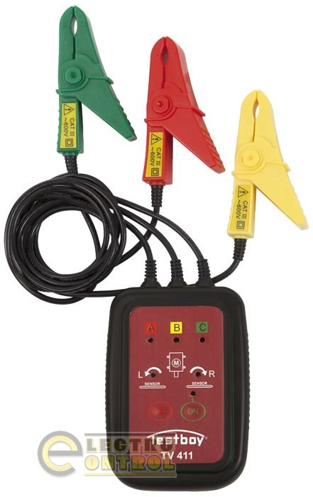 На сайте ecshop (Электроконтроль) Вы можете ознакомиться и купить бесконтактный тестер порядка чередования фаз TESTBOY TV 411 немецкого бренда Testboy. С помощью TESTBOY TV 411 можно определить последовательность фаз , направление в котором вращается поле наружного проводника, эти свойства используются для решения задач технического обслуживания устройств с двигателем и многофазных сетей. Благодаря бесконтактному измерению при помощи цветных изолированных клемм, сервисное обслуживание проводится быстрее с минимальным риском опасности контакта с электрически активным проводником. Также вмонтированный тестер вращения показывает бесконтактным измерением переменного магнитного поля, в каком направлении вращается вал двигателя.