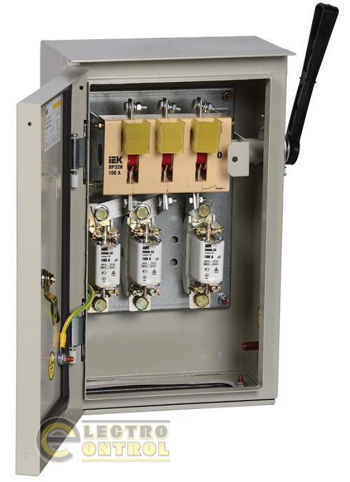230 В частотой 50 Гц. Внутри корпуса установлены выключатель-разъединитель ВР-32И, три держателя предохранителей ДП-33 с предохранителем ППНИ-33. Ввод и вывод кабелей предусматривается снизу. Ручка управления выключателя - разъединителя ВР-32И выведена наружу.