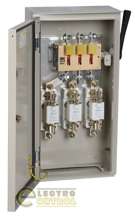 230 В частотой 50 Гц. Внутри корпуса установлены выключатель-разъединитель ВР-32И, три держателя предохранителей ДП-33 с предохранителем ППНИ-33. Ввод и вывод кабелей предусматривается снизу. Ручка управления выключателя - разъединителя ВР-32И выведена наружу.