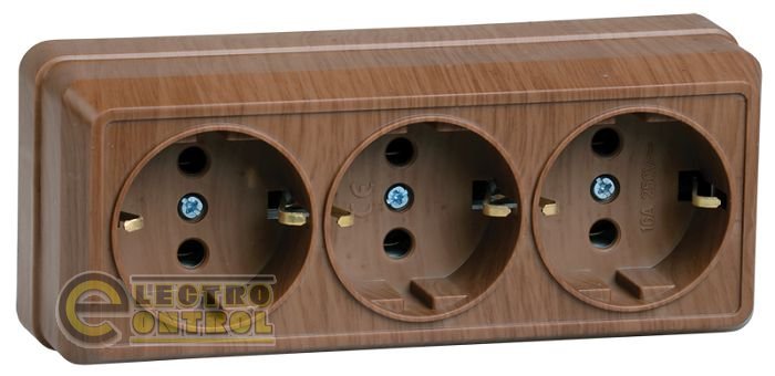 Розетка тримісна із заземленим контактом 16А відкритої установки РС 3-ОД ОКТАВА (дуб)