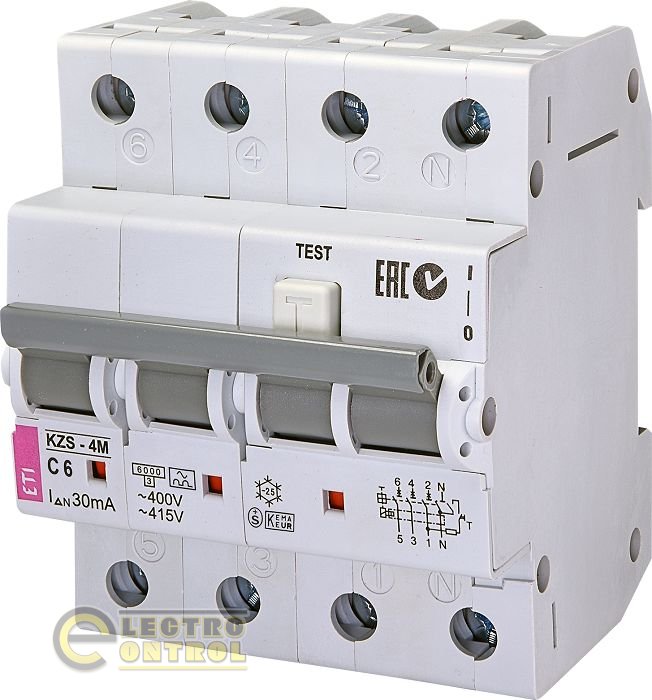 На сайте ecshop (Электроконтроль) Вы можете ознакомиться и купить дифференциальный автоматический выключатель KZS-4M 3p+N C 6/0,03 тип A (6kA) 2174921 ETI.