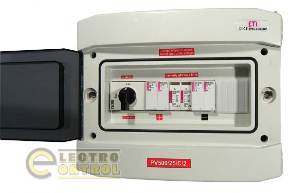 Распределительные щиты PV специально разработаны для использования в системах защиты солнечных батарей и имеют два варианта комплектации – на 13А и 25А. Щиты комплектуются ограничителями перенапряжения ETITEC PV, а также выключателями нагрузки LS SMA. Данная комплектация щитов обеспечивает защиту солнечных батарей от токов короткого замыкания и перегрузки, а также от импульсного перенапряжения. Щиты имеют один или два ввода, что соответственно позволяет подключение одного или двух стрингов.